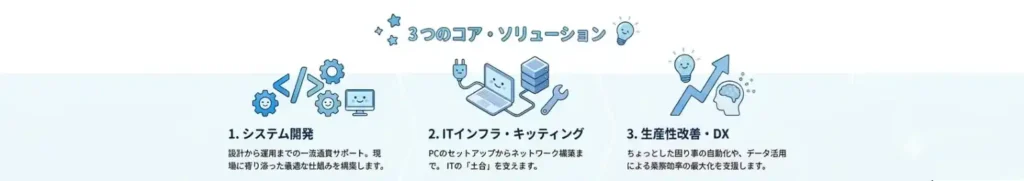 ITの力で、現場の「困った」を「安心」へ。日本アシストは、システムの構築からキッティング、運用・保守までワンストップで支えます。常にお客様の隣で課題を見つめ、技術と誠実さで理想のビジネス環境を共に実現する、ベストパートナーであり続けます。